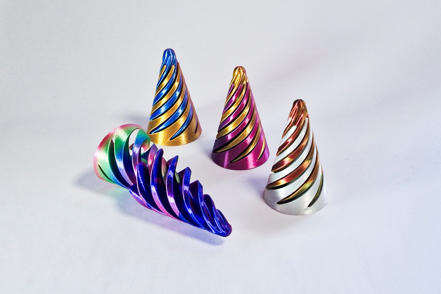 Spiral cones are a little bit mind-bending - you can flip one of the pieces upside-down and it'll STILL pass through! And all with a unique sensory feel - this is an example of how the layers from 3D printing can contribute to the feel and sound of a fidget.